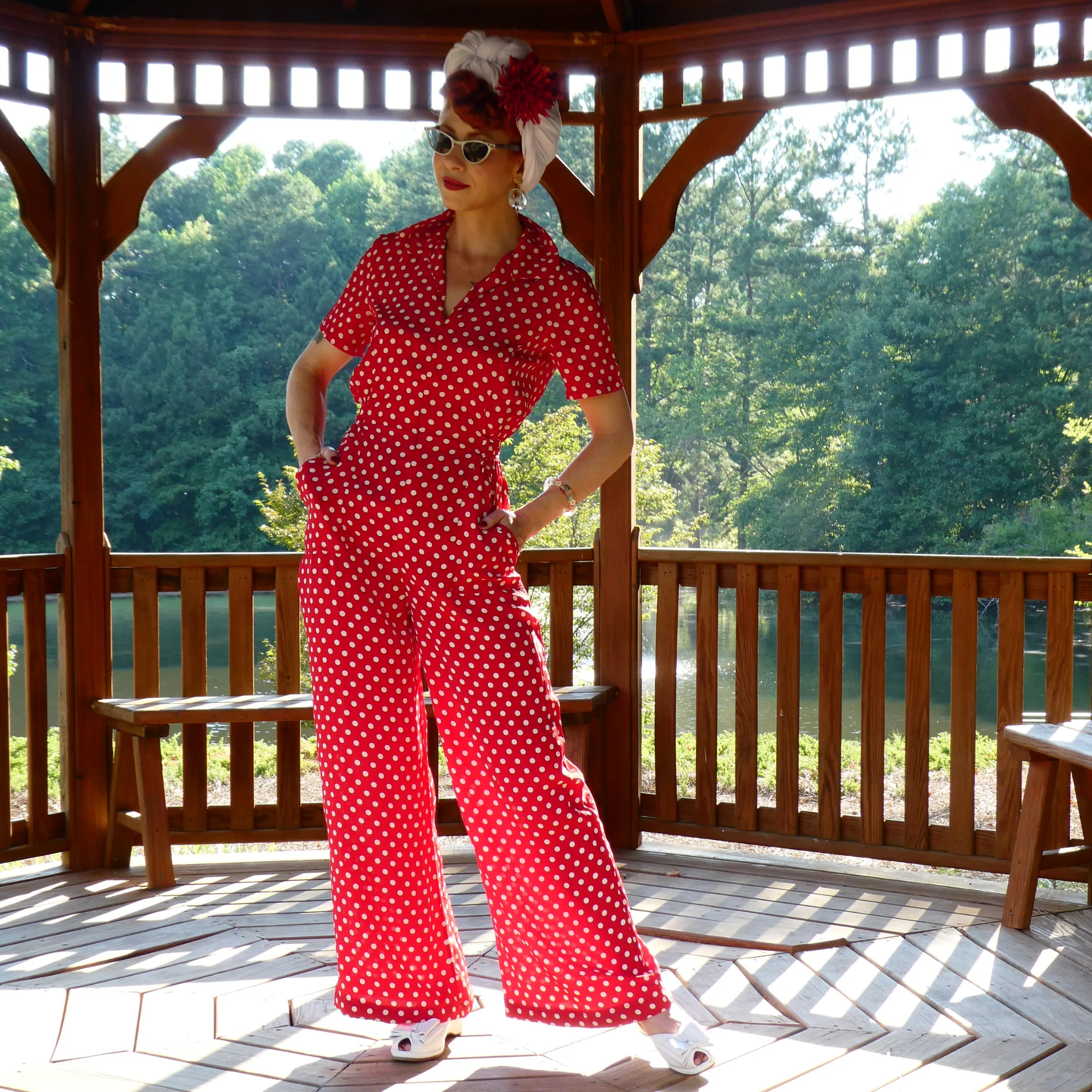 A stunning and authentic Hollywood-style siren suit with an elasticated waistline, wide-leg trousers, and turn-back sleeves.