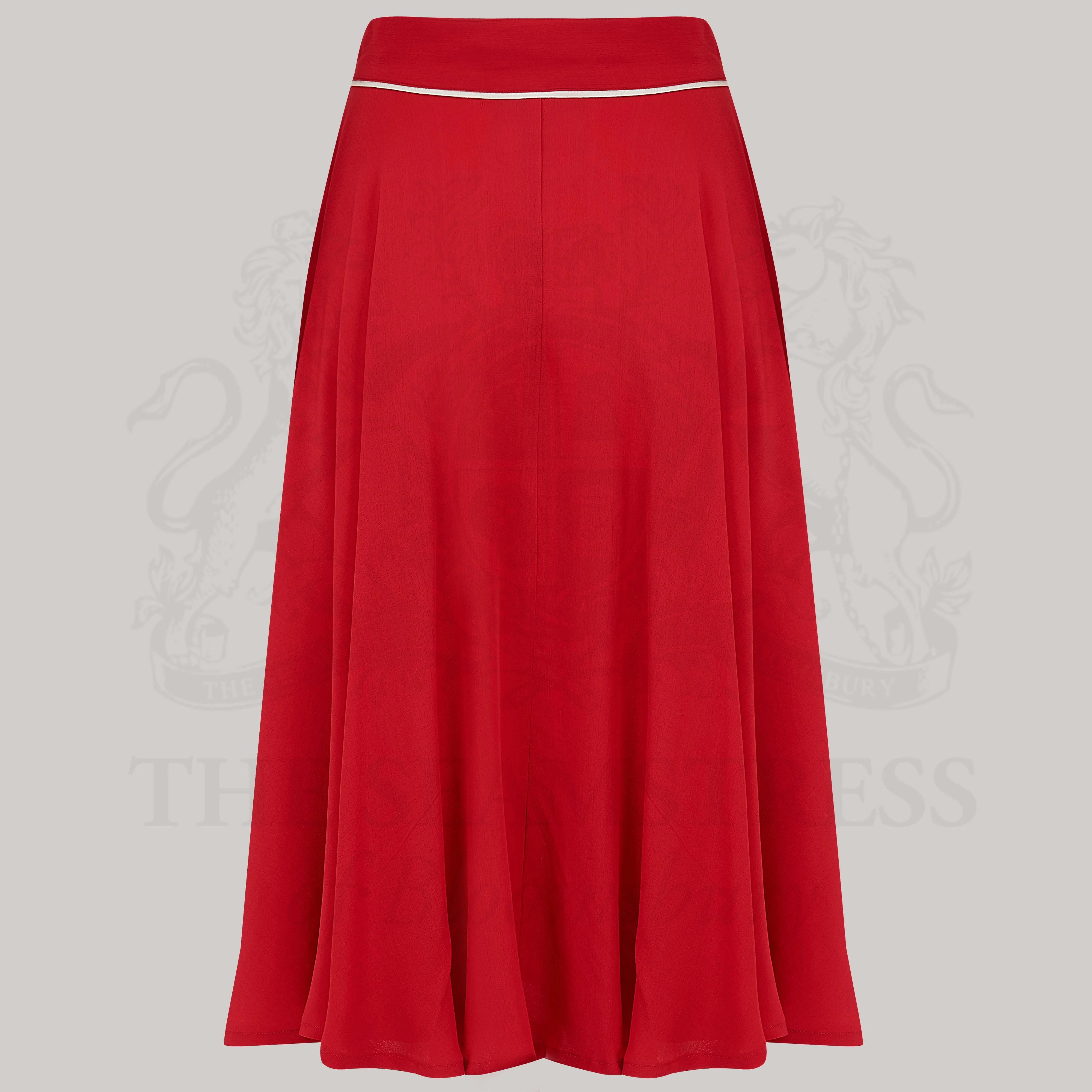 Radiating 1940s glamour, this swing skirt is crafted with four yards of luxurious fabric, adorned with contrasting cream elements for a sophisticated touch, all secured with a discreetly hidden side zip closure, offering elegance and practicality.